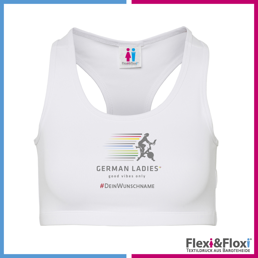 Sport-Bra, Vorderseite bedruckt mit Logo der German Ladies. Auf Wunsch individualisierbar mit Deinem Leaderboardnamen.
